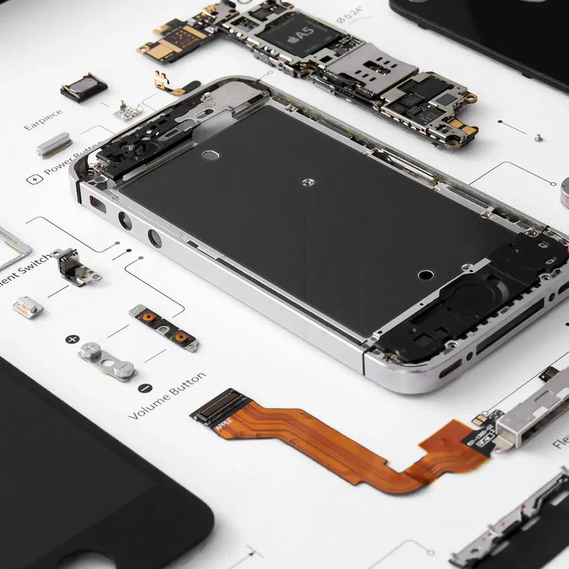 Each frame features the carefully arranged internal parts of an authentic iPhone model — beautifully displayed in a clean, minimal design that fits any workspace or room setup.