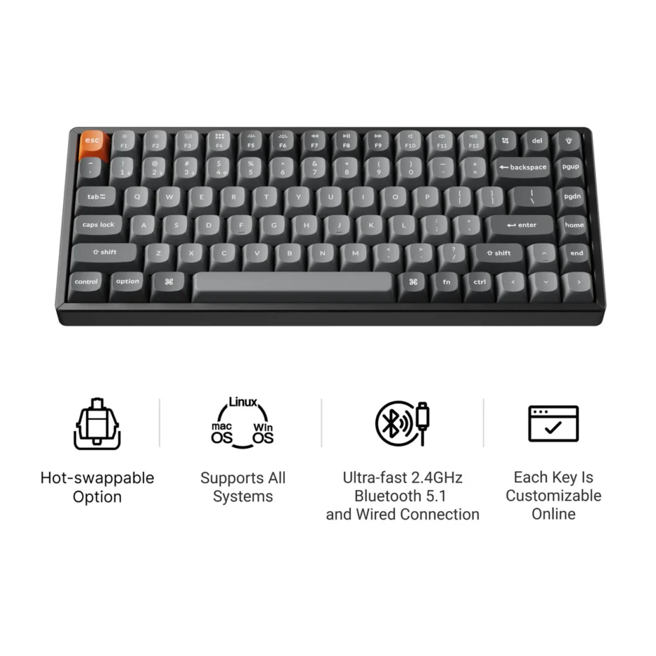 The open-source QMK firmware means endless possibilities for key remapping, macros, shortcuts, and more. Now you can easily customize each key with the Keychron Launcher web app.