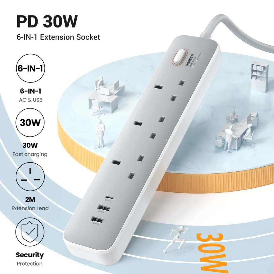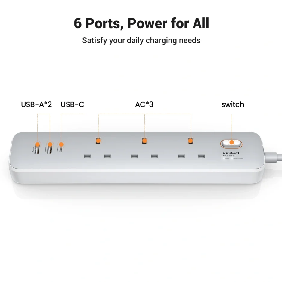 • 1x UGREEN 3-Outlet Surge Protector Extension Cord with Master Switch, 30W Type-C Port + Dual USB-A Ports (2A1C)